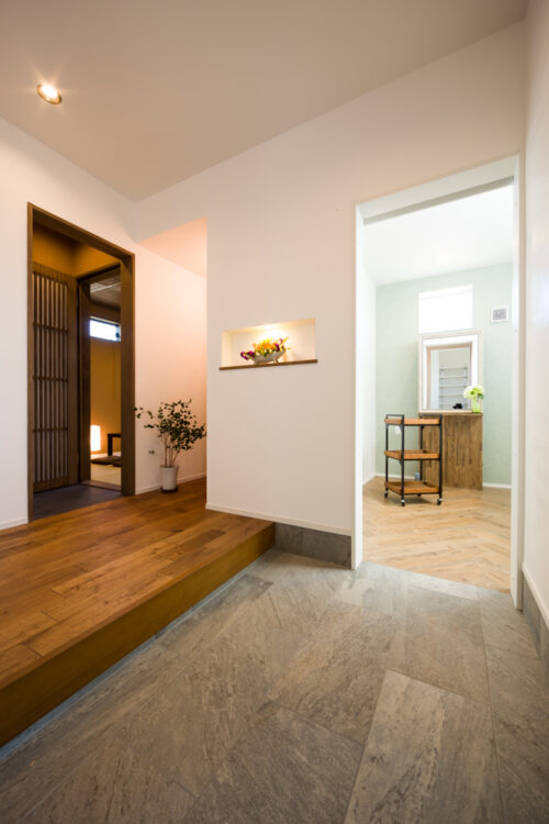 玄関脇にはガーリ―なデザインと、手入れのしやすい床が特徴の奥様こだわり、カットスペース。