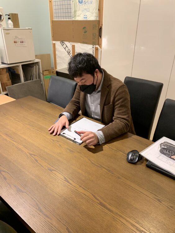 写真は、打合せ後に今日の打合せ内容を黙々とまとめている佐野(設計)です!