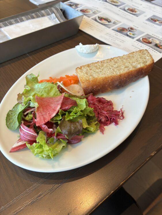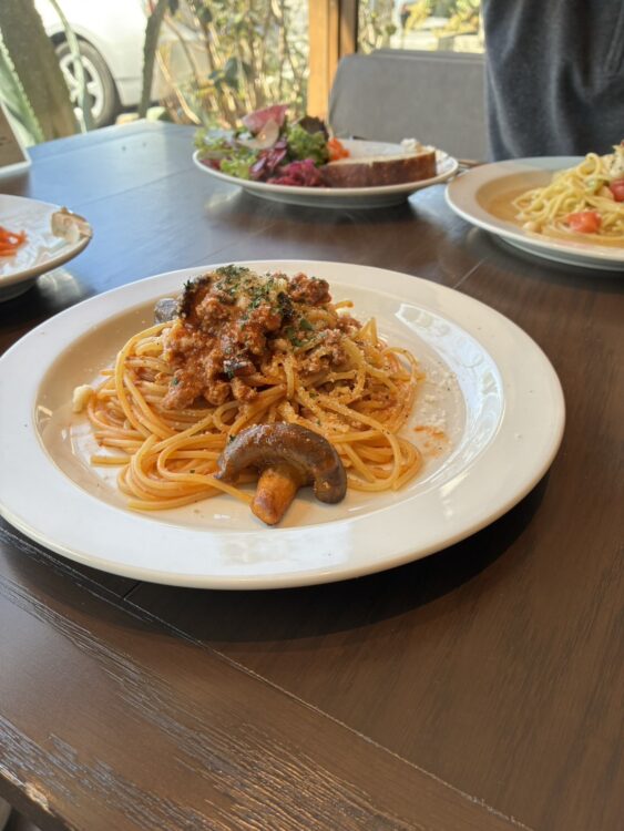 ボロネーゼのパスタにホカッチャとサラダのセット! 生麺が美味し!!!久々に生麺食べましたが、イケますね!!