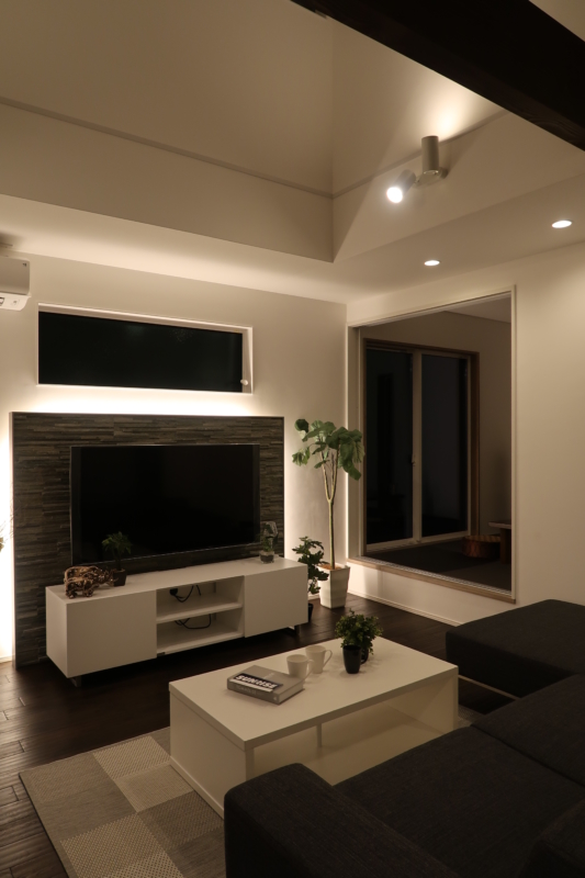照明が醸し出すなんとも居心地のよさそうなリビングと、その横にある和室。