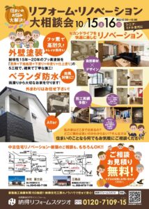 10/15(土)16(日)【外壁塗装】【ベランダ防水】などお家を長持ちさせる為のメンテナンスメニューも!住まいのお悩み大解決☆リフォーム大相談会開催!!