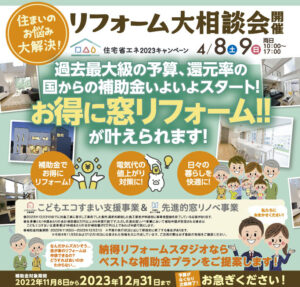 4/8(土)9(日)リフォーム相談会【過去最大級の予算・還元率の補助金スタート!】お得に窓リフォームが実現!