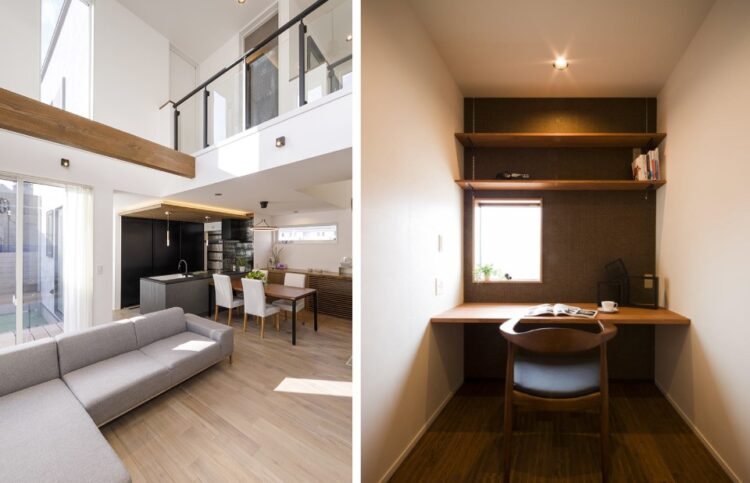 2階に作った個室の書斎を出ると、いつでも1階のリビングで寛ぐ家族の様子を感じられます。