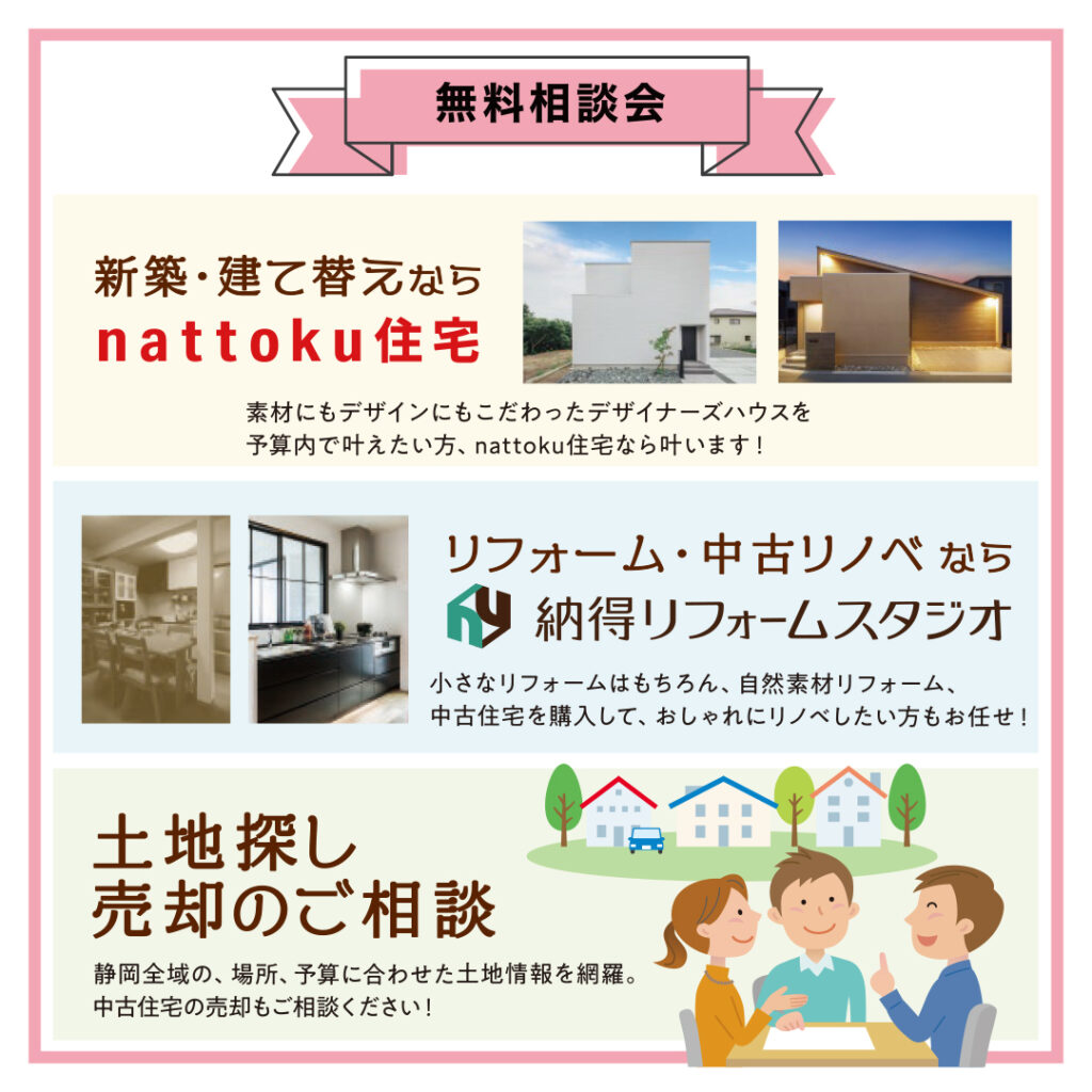 「なっとく住まいるフェア」では、新築・建て替え・リフォーム・中古住宅・土地探し・おうちの売却など、どんな住まいのお悩みもワンストップでご相談いただけます。