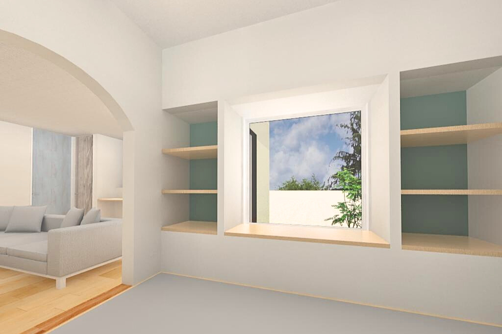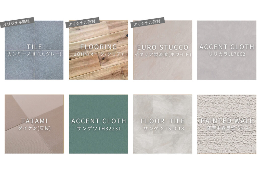 明るい色味をベースにお家全体をコーディネート。畳コーナーの「ヌック」に爽やかなグリーンをアクセントを取り入れています。家族が集まるリビングはオリジナルの無垢の床(JOHN)を選びました。凸凹とした表面は足に吸い付くような心地よさです。