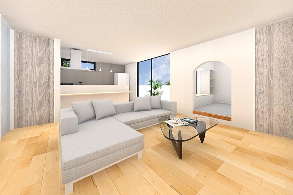 4LDKの26.5坪。廊下という空間をなくし、家族でくつろぐことの多いリビングを12畳設けました。内装はナチュラルクリアにライトブルーをアクセントに。ポイントであるかわいい照明も見所です。