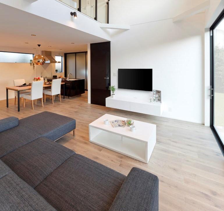 リビングドアを開けると、吹き抜けのある開放的な22帖のLDKが広がっています。洗面室とリビングそれぞれに直通できるふたつ動線が設けられているので