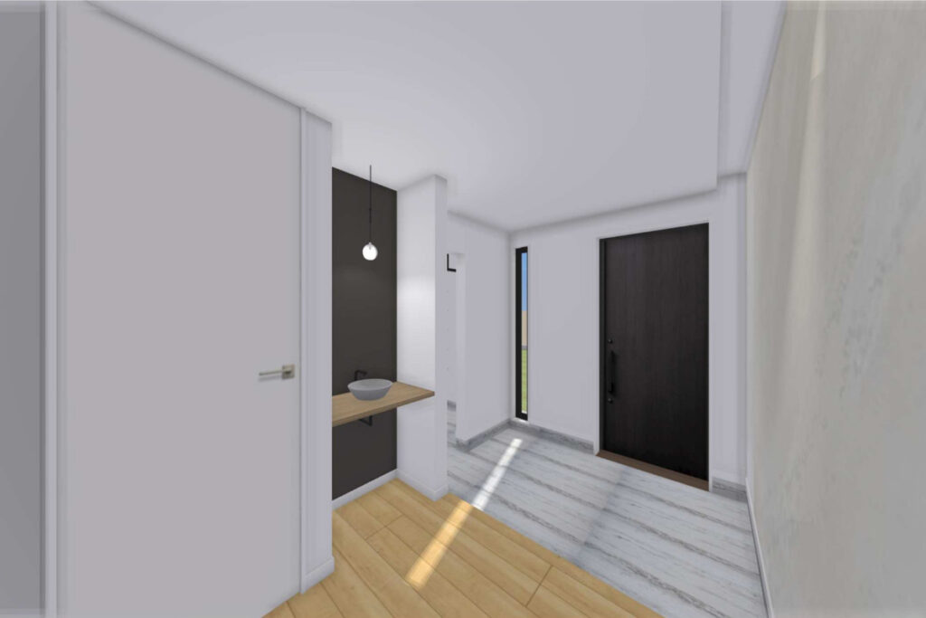 帰ってきてすぐに手を洗えるようにもうけた洗面台。その他にも、キッチン裏に水周りを集約した回遊できる動線で「欲しい!」がギュッと詰まった家事ラクな配置になっています。