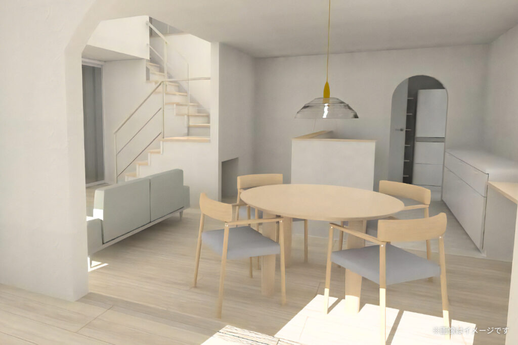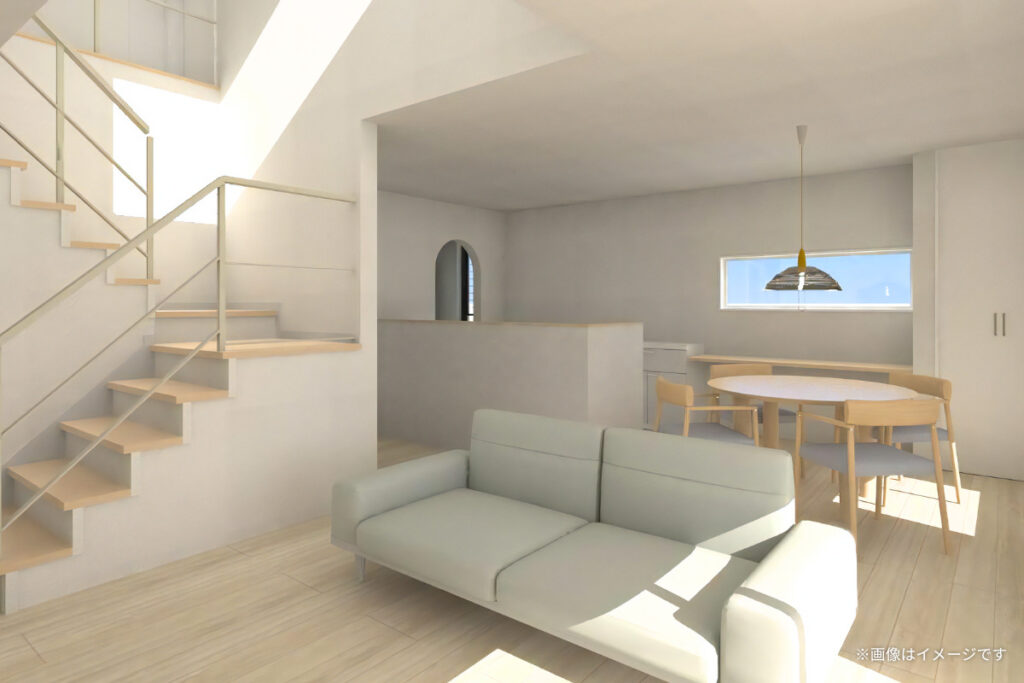 洗面、ウォークインクローゼット、キッチンパントリーへと続く買い物帰りにうれしい回遊動線。そしてお子様の遊ぶリビングや小上がりスペースはキッチンから目の届くお母さんに嬉しい間取り。アーチ状の垂れ壁や丸い家具のディティール、ベージュと木目で統一した優しい雰囲気が、家族を包み込みます。