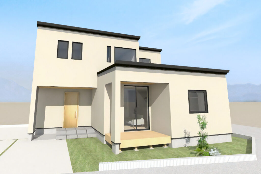 内装に合わせ、ベージュと木目を統一した外観。屋根付きテラスと広々ポーチが前後に伸びる奥行を感じさせます。