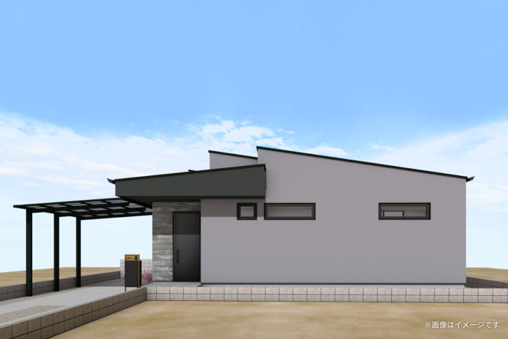 長く伸びる駐車場からのアプローチ。一番目につく玄関周りにアクセントを持たせました。密集地でありながら、明るさと開放感を得られるよう設計しています。