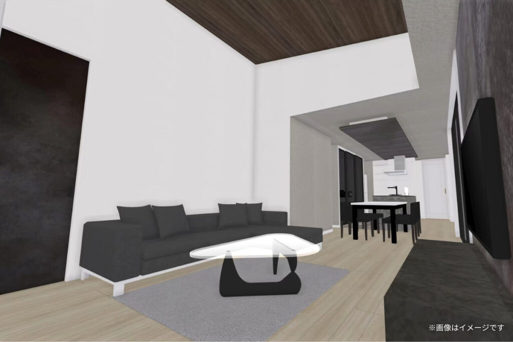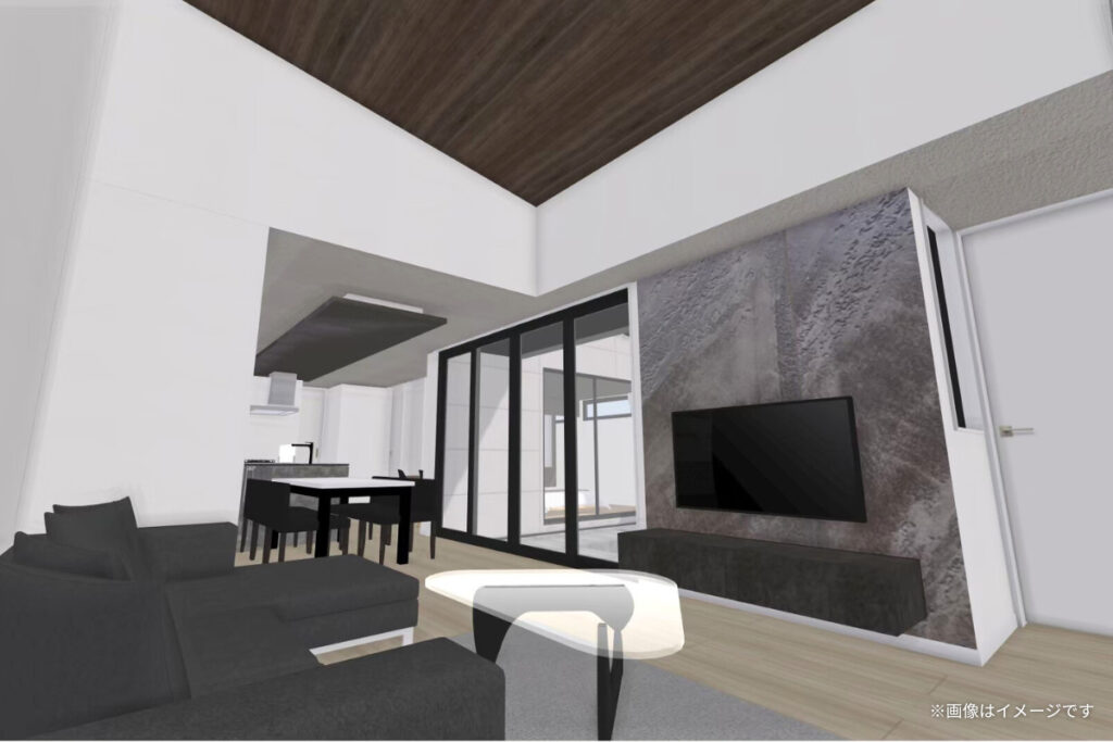 プライベート感のあるテラスを囲うように配したグレーを基調とした無彩色の色づかいのLDK。リビングの木目の天井はダークカラーで上品な印象に。
