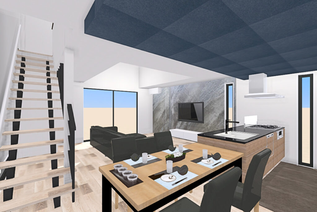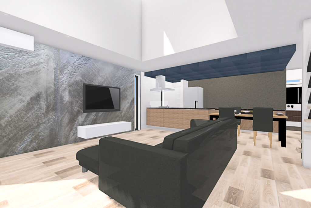 ダイニングキッチンの下がり天井・リビングのイタリア製漆喰(ユーロスタッコ)・家具をブラックにすることで空間を引き締めたメリハリのあるLDKに。