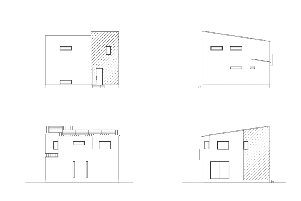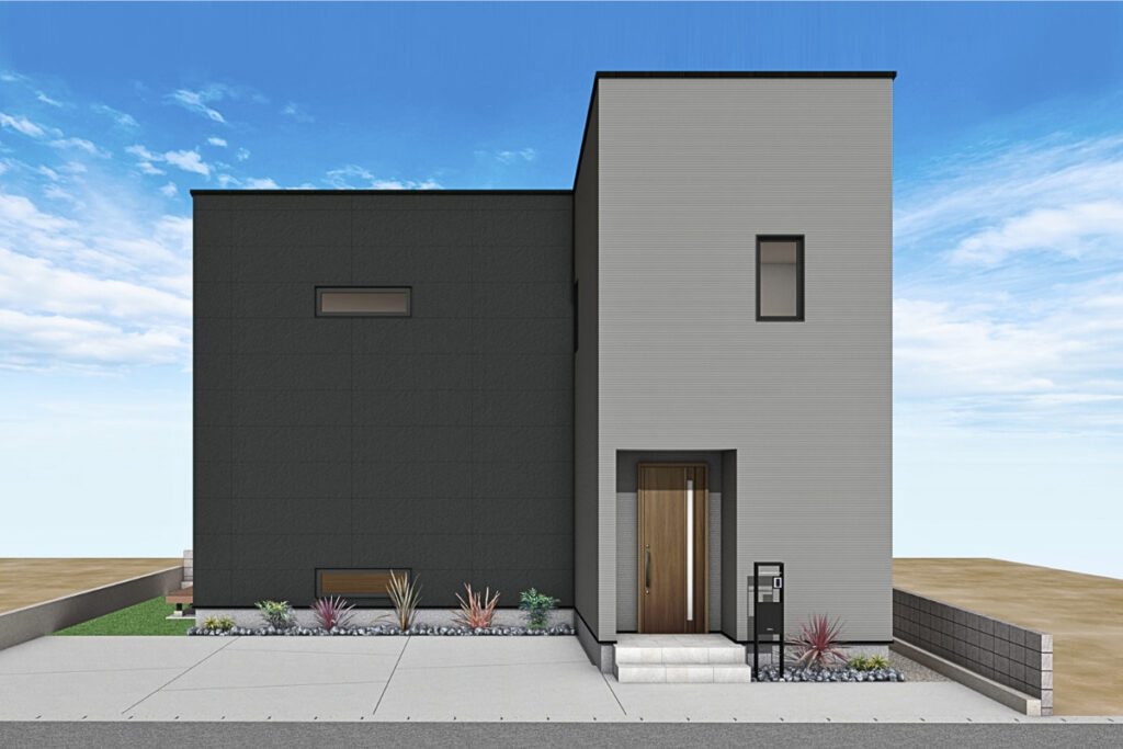 奥行きを感じるツートンカラーでコーディネートしたモダンな外観。北側が正面のお家だからこそ、無駄のないシンプルなファサードに。