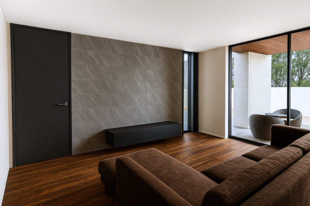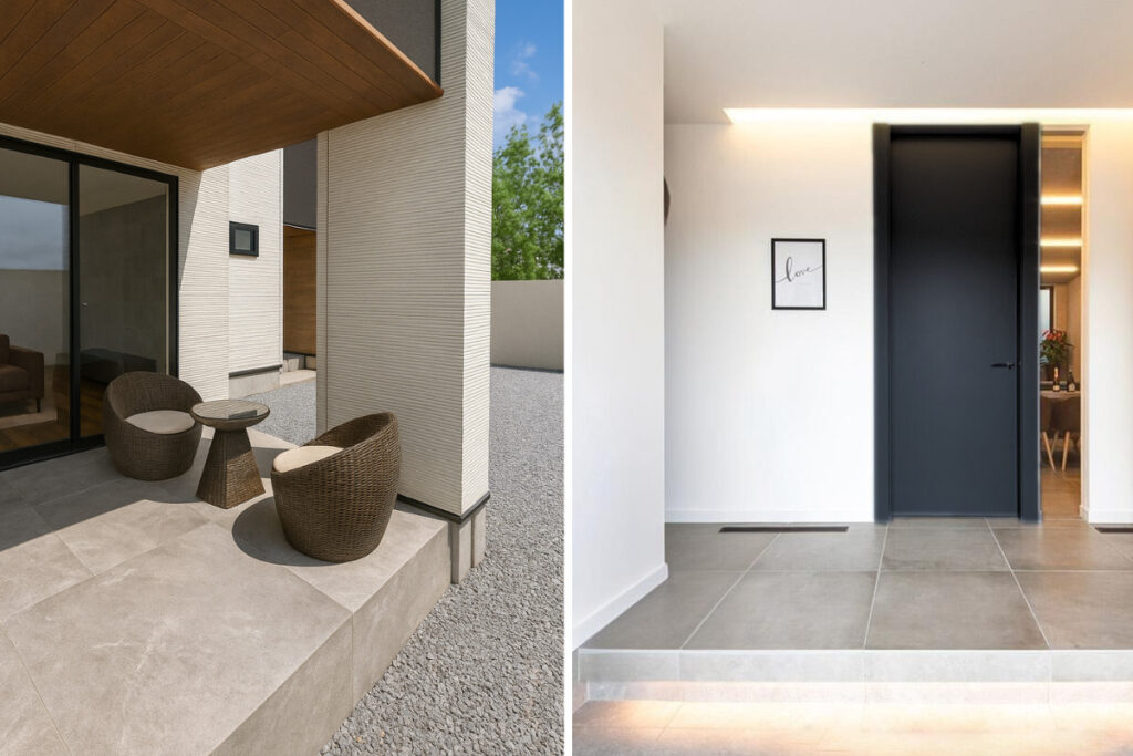 リラックスできる上質な空間が心地よい1階のLDK、6畳のタイルデッキにフラットに繋ります。玄関は全てタイル仕上げ、間接照明とイタリア製オリジナルハイドアのブレラがお出迎えします。