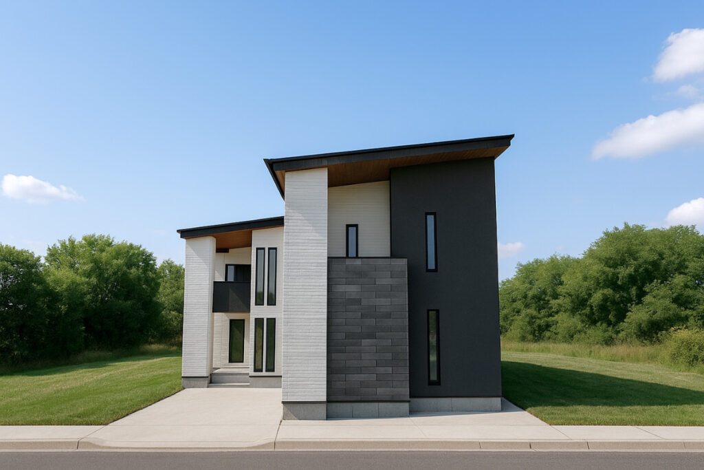 2面道路からの見栄えを考慮し、どの面からも立体感の出るボリュームと、素材はタイルと木目とALCを組み合わせながら、軒を出すことで奥行き感の出る外観としました。