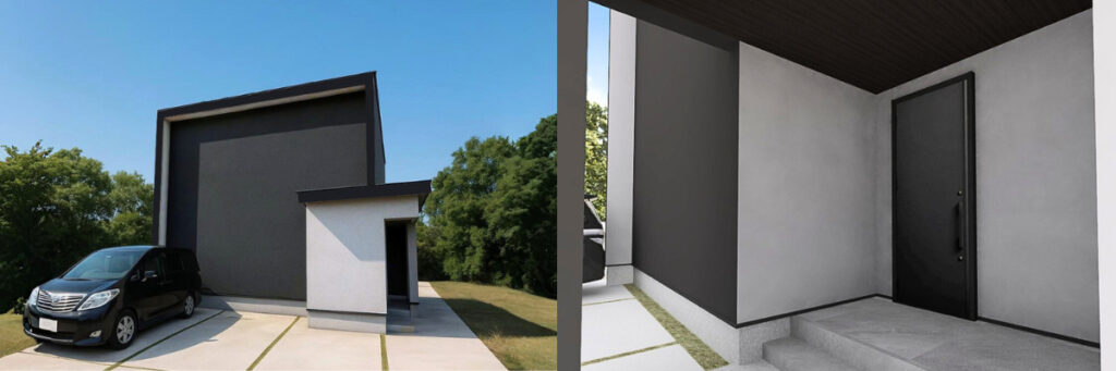 ワンちゃんと暮らす、愛情いっぱいのお宅が完成いたしました。屋根付きでゆったりとした玄関ポーチは、オーナー様のこだわり。モノトーンでまとまったスタイリッシュな外観が目を引き、昼・夜で異なる雰囲気を演出いたします。