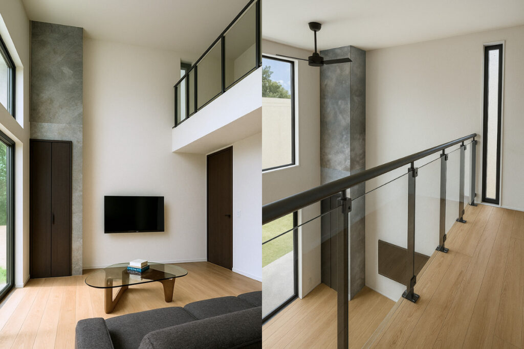光降り注ぐ大きな窓と、ユーロスタッコの迫力あるデザイン柱がみどころのリビング。吹き抜けを渡る“空中廊下”に立つと景色が望める大きな窓とガラス手すりにより、広がりのある開放感を感じられます。