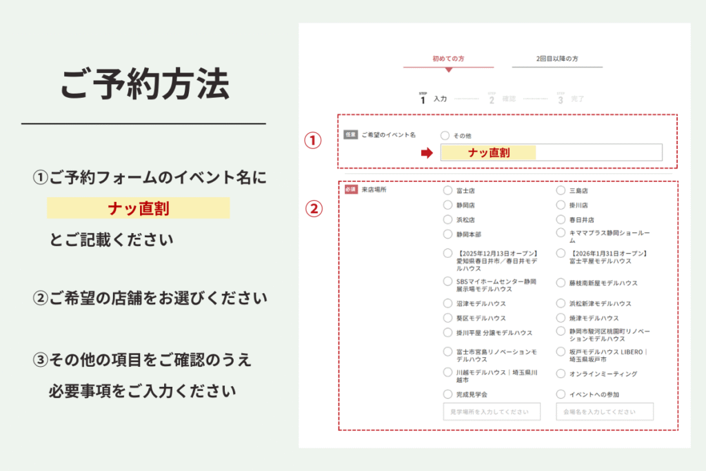 nattoku住宅の公式サイトから、ご来店予約フォームを通して直接ご来場いただいたお客様限定で、お見積金額から30万円を割引させていただきます。