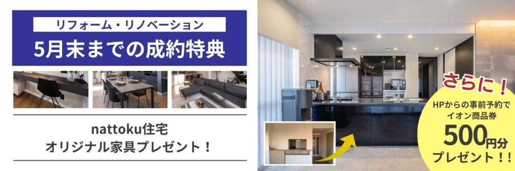 5月末までのリフォーム・リノベーションのご成約で、nattoku住宅オリジナル家具をプレゼント!
