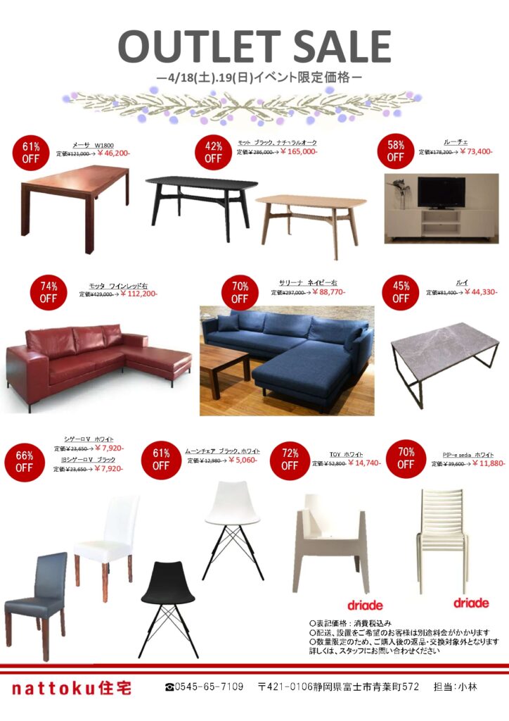 毎回大好評のアウトレットセールでは、nattoku住宅オリジナルのソファ・ダイニングセットやデザイナーズ家具が勢揃い!家具の質感や座り心地をお気軽にお試しください!