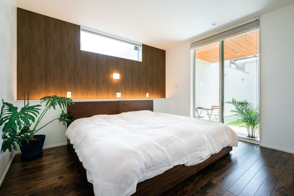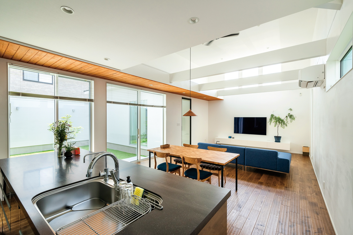こうして、150坪ある広々したな敷地を活かしたコの字型の平屋が完成。防犯面にも配慮して視線の高さに窓をつくらず、内側に31帖の大きなパティオを設けました。