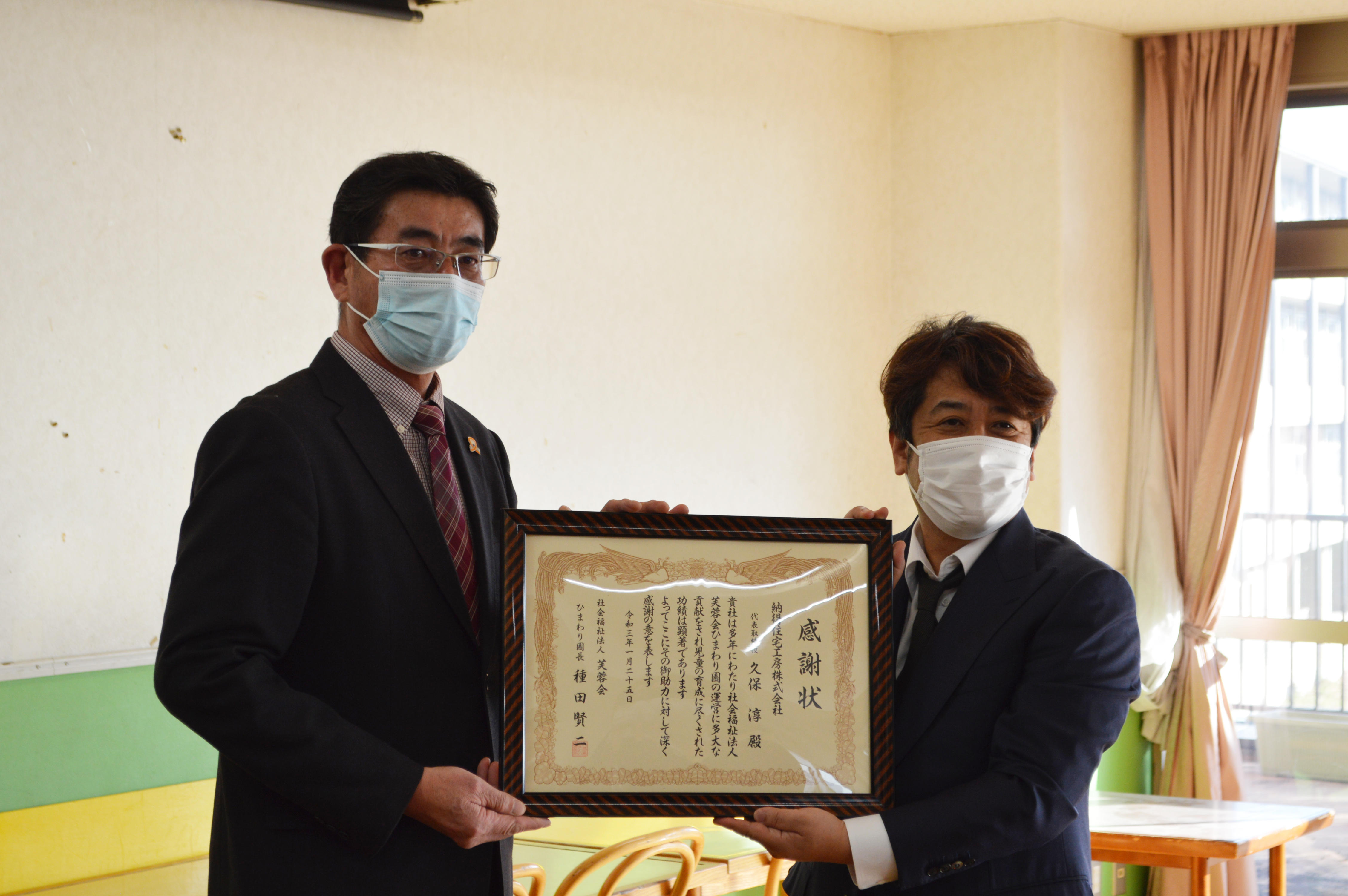 2021年1月25日、同社会福祉施設にて、園長様より感謝状を拝受いたしました。