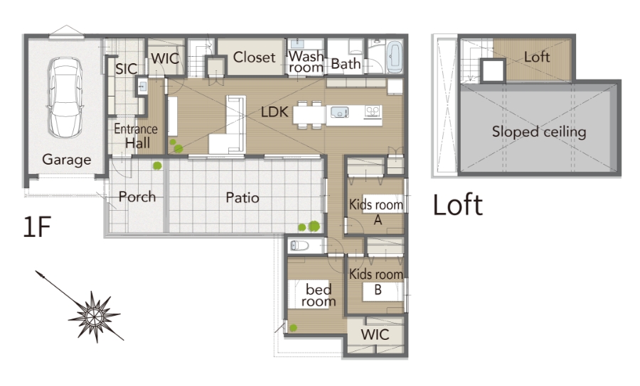 16帖のパティオ(中庭)を中心に、採光とプライバシーを両立した開放的な平屋設計が魅力。ダイナミックな勾配天井のLDKとパティオが響き合い、格別な開放感をもたらします。